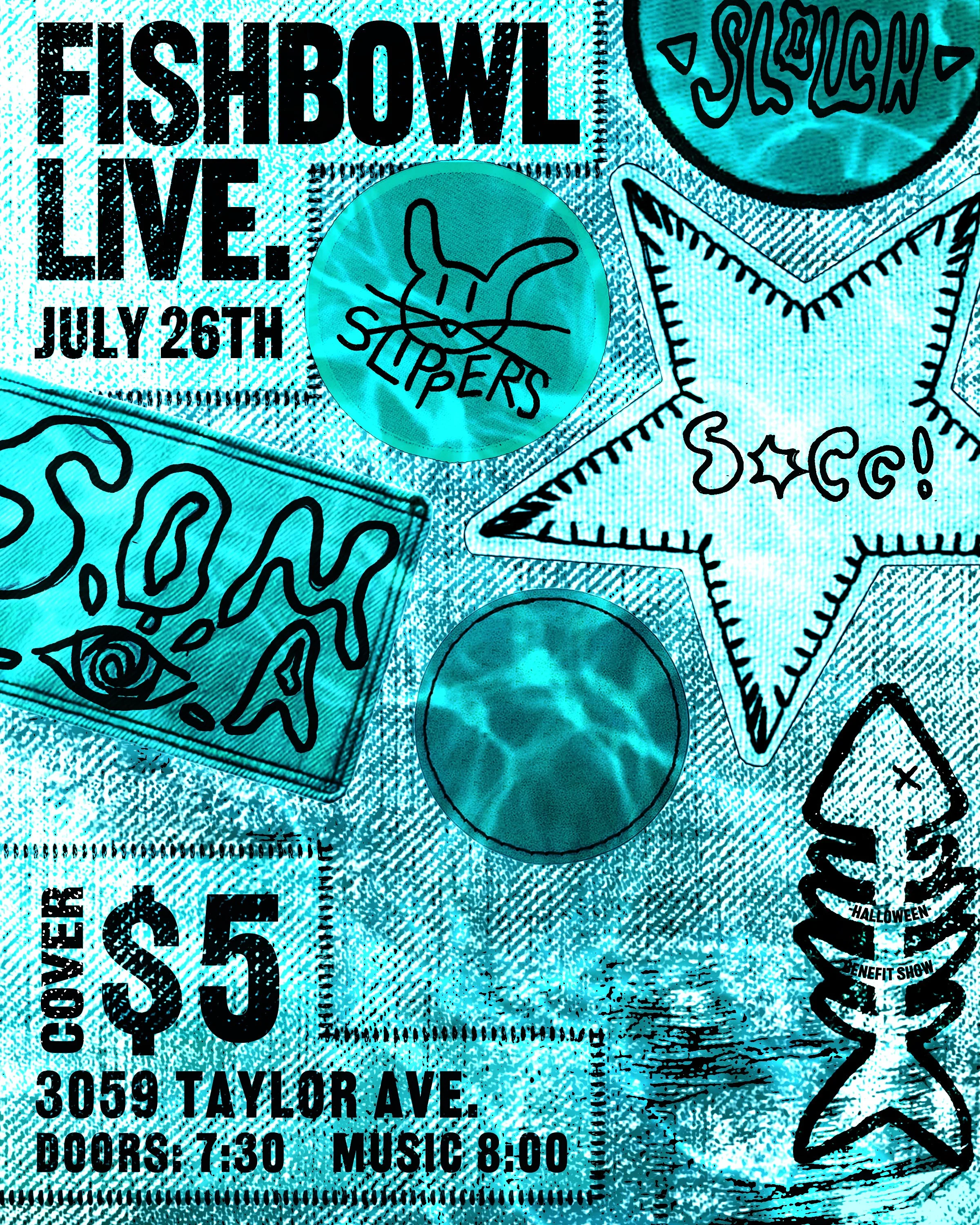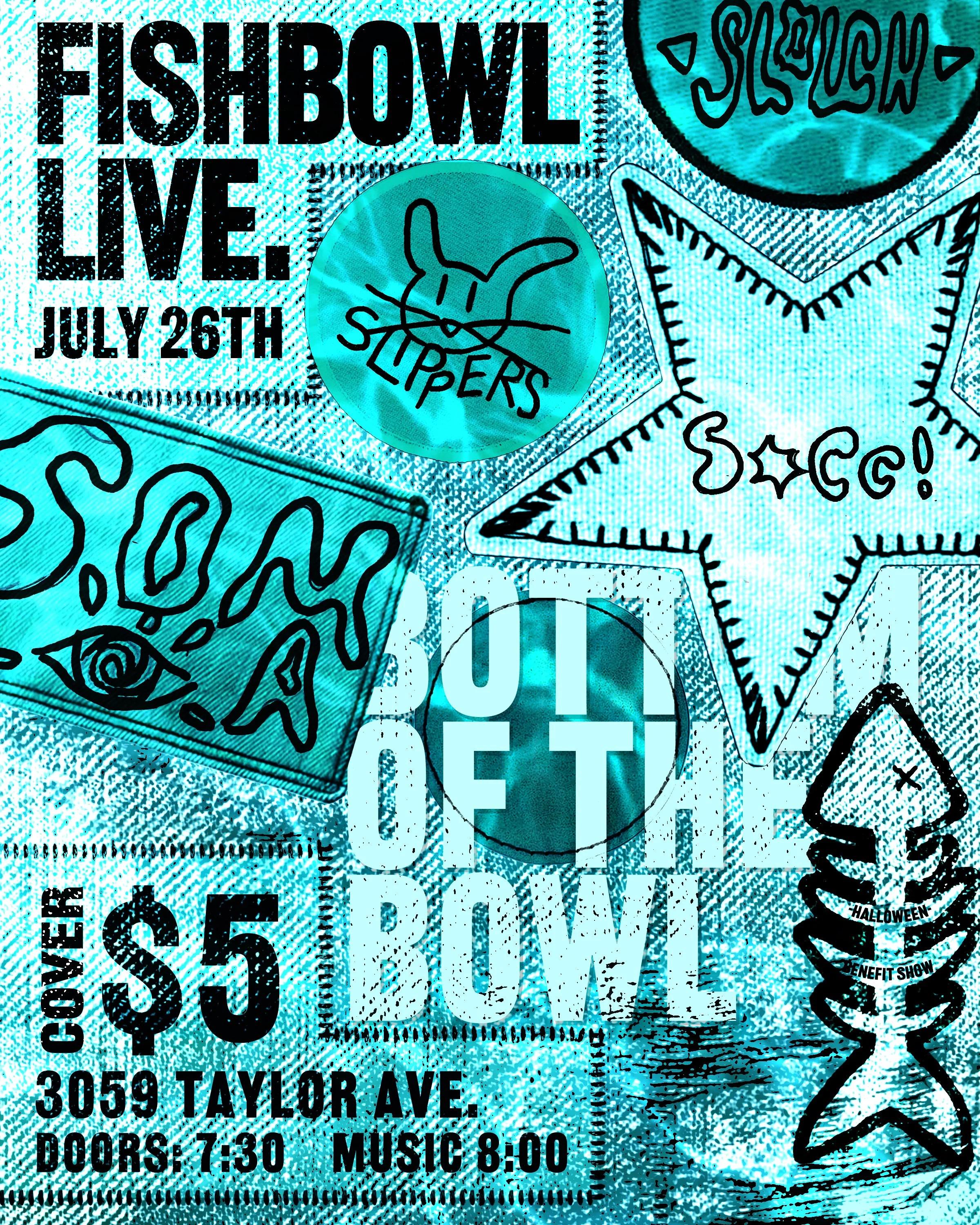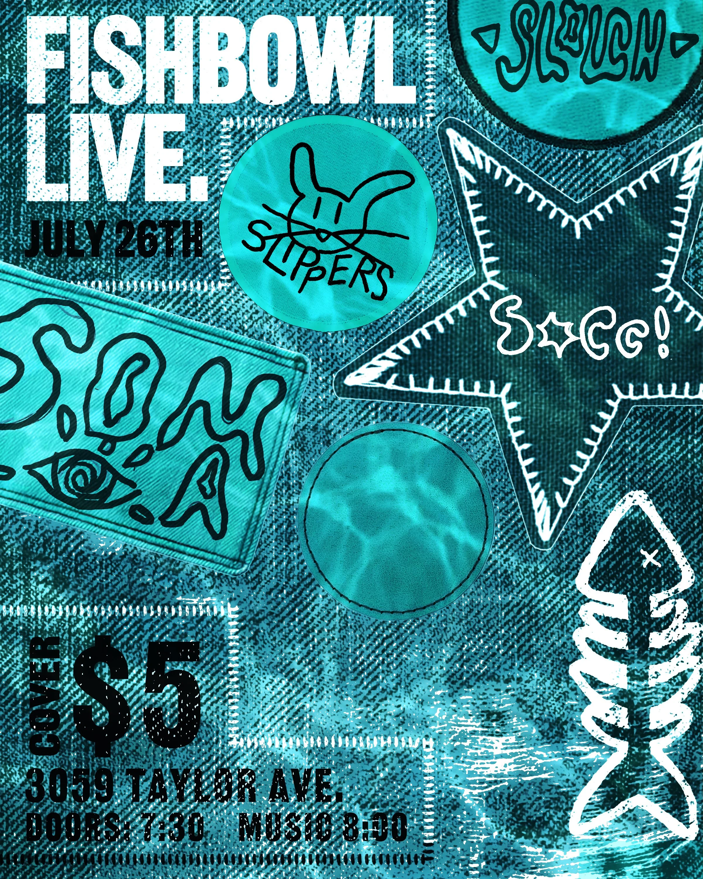 More so than any other flyer I’ve ever worked on, I wanted this one to feel more personal to both the bands and the venue. To honor this and also allude to the DIY feel of “Fishbowl Live” and the local vendors that sell their work there, I decided to hand-draw a lot of aspects and started with an idea similar to patch-work jeans.