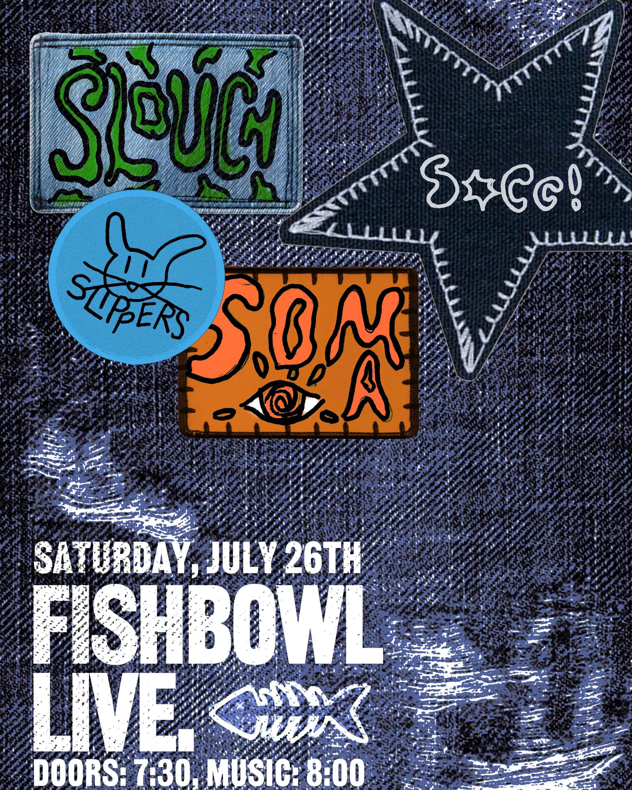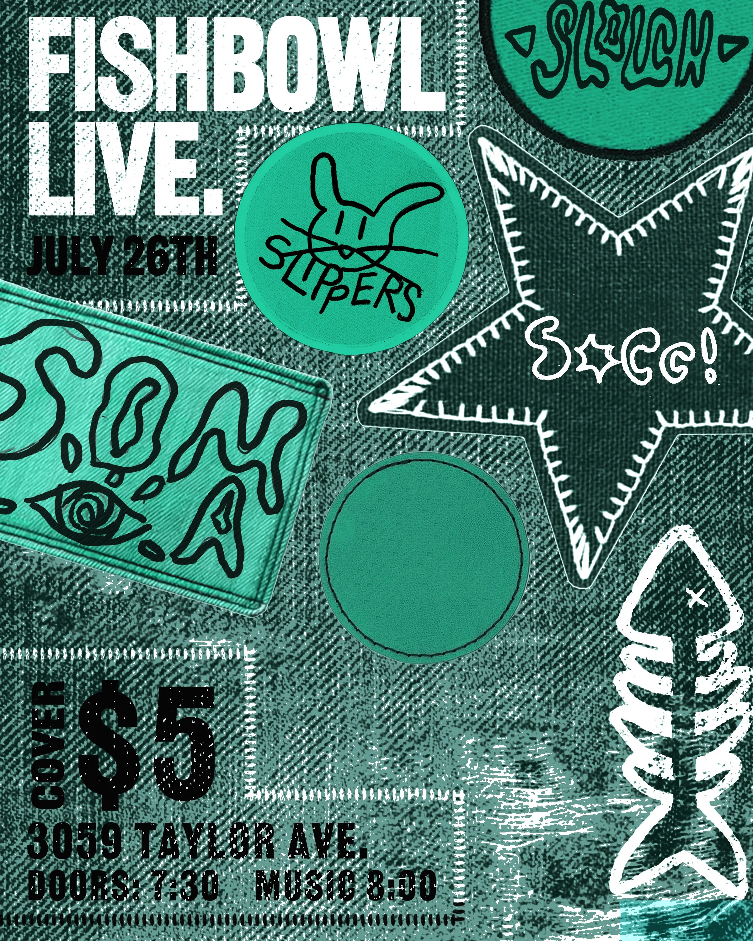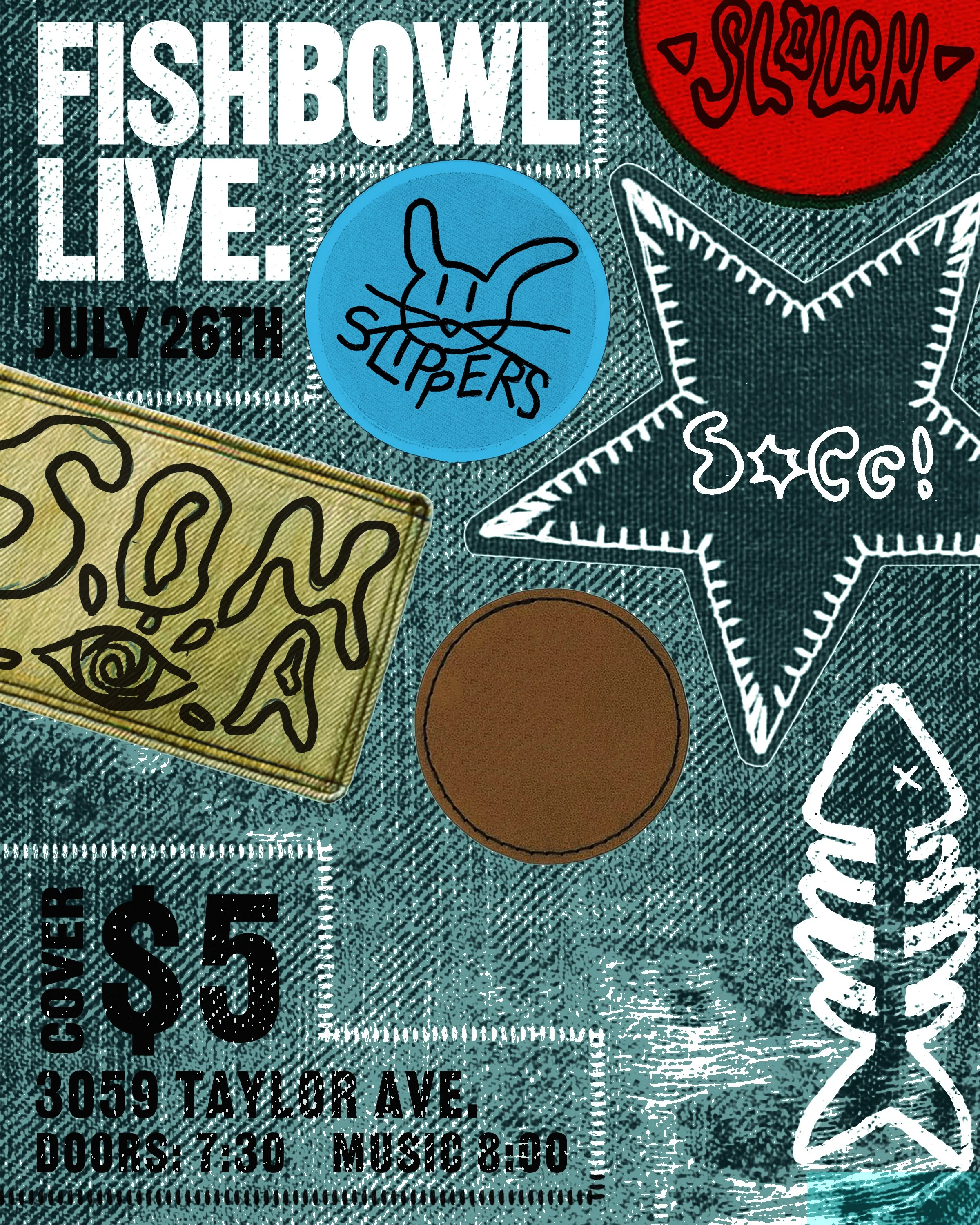 More so than any other flyer I’ve ever worked on, I wanted this one to feel more personal to both the bands and the venue. To honor this and also allude to the DIY feel of “Fishbowl Live” and the local vendors that sell their work there, I decided to hand-draw a lot of aspects and started with an idea similar to patch-work jeans.